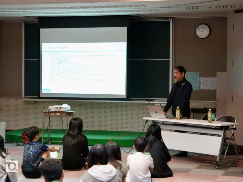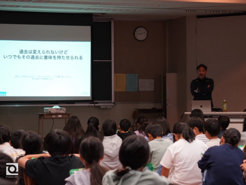 子どもたちが夢や社会との関わりから自分らしい生き方を考える時間として、自身の経験をもとに思いを語りました。
