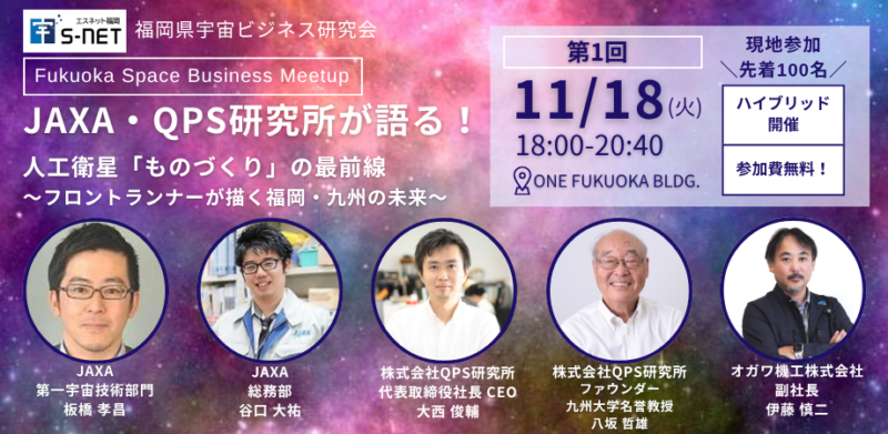 | イベント名 | Fukuoka Space Business Meetup 「JAXA・QPS研究所が語る!人工衛星『ものづくり』の最前線」 |